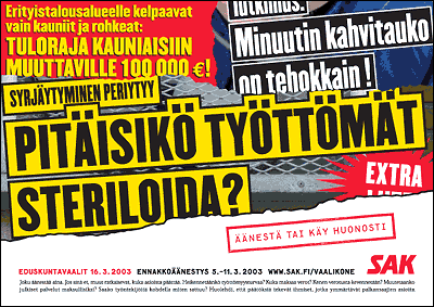 SAK:ssa ajatellaan, että äänestäminen on olennainen osa ay-liikkeen harjoittamaa edunvalvontaa. Viime keväänä tehdyn jäsenkyselyn mukaan vain 42 prosenttia SAK:n jäsenistä aikoi varmasti äänestää seuraavissa eduskuntavaaleissa. Luku merkitsee sitä, että miltei 600.000 SAK:laista saattaa jäädä maaliskuun 16. päivänä kotiin.